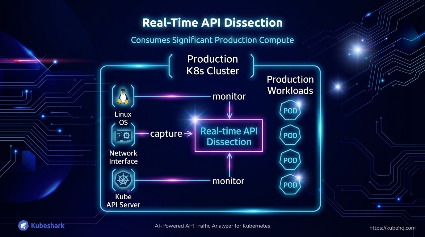 With delayed API dissection, traffic is captured on production nodes with minimal overhead, stored, and later dissected on non-production compute. The resulting insight may be generated shortly after capture or at a later time, depending on the workflow, while keeping the impact on production workloads low.