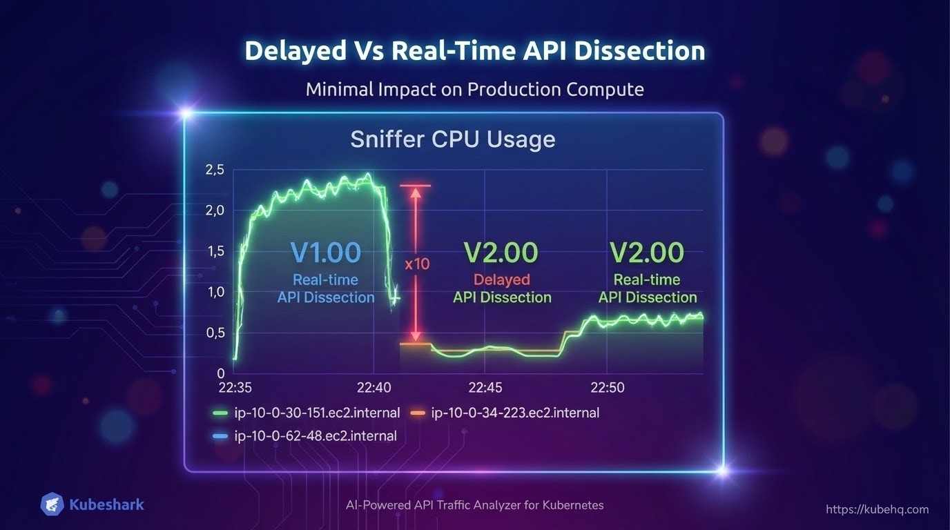 Dissecting cluster-wide traffic, Kubernetes and Operating System events into API calls requires substantially more CPU and memory than simple packet capture. Across two years of V1.00 deployments in production environments, one pattern was consistent: real-time API dissection accounted for most of the resource usage, while traffic capture itself remained comparatively lightweight.