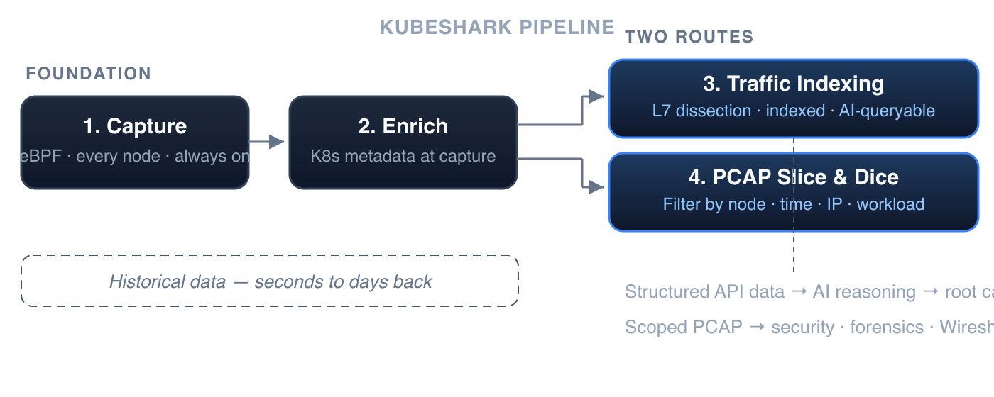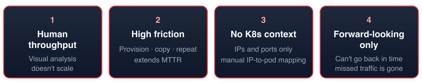 Even if the format problem were solved, the remaining shortcomings persist: the friction of capturing PCAP files, the storage requirements, the absence of Kubernetes context, and the inability to look backwards.